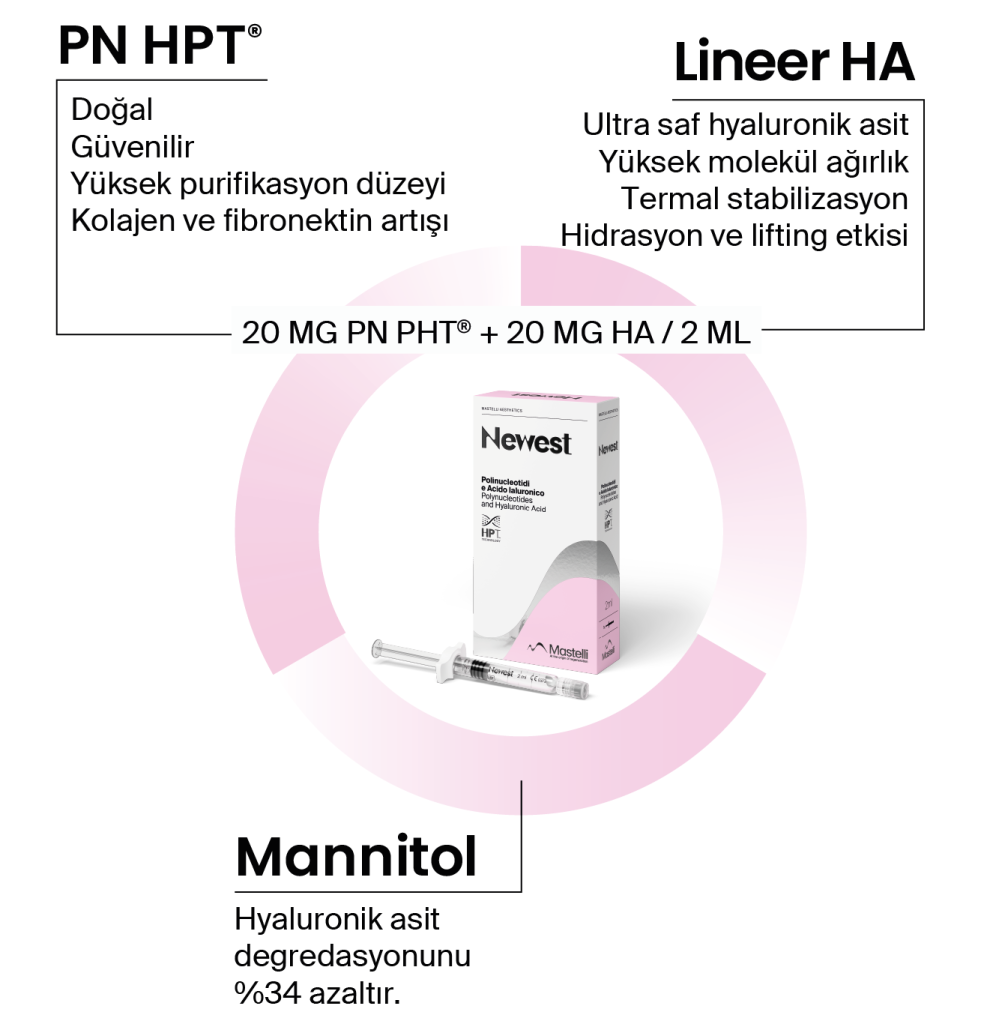 “Gençliği kalıcı kılmak, zamanı durdurmak, görünür yaşlanmanın izlerini silmek ya da zamanı geri almak” gibi söz dizilerini bir araya getirdiğimizde aklınıza gelen ilk medikal estetik uygulama, 1950’den beri artık standart haline gelmiş mezoterapidir. Mezoterapi kozmetik dermatolojide derinin orta katmanına mikro incelikle iğneler aracılığı ile cilt sorunlarına yönelik moleküllerin verilmesi işlemidir. Düşük molekül ağırlıklı ürünler cildin epidermis yani üst katmanında etkili olan mezoerapi ajanları iken, cildin alt katmanlarını onaran ve tamirini sağlayan yüksek molekül ağırlıklı ürünler mezoterapiden daha güçlü etki göstermektedir. Mezoterapiden farkı, cilde hafif bir hacim kazandırır ancak dolgu gibi yüzü şişirmez. Cilt alt katmanlarında tamirat sağlar ve yenilenme etkileri uzun sürer. Uygulaması yapılan ve halk arasında Somon DNA’lı mezolift ya da mezoterapi yöntemi olarak bilinen mikro enjeksiyon yöntemi ya da dermaroller-dermapen ile cilt ve cilt altına uygulama yapılır. Mezolift yöntemi ile epidermal tedavi uygulanabilmektedir. Mezoterapi ve mezolift uygulamaları ile cildin, kolajen ve elastin üretimi artırılarak cilt yenilenmesi hedeflenir. Mezolift sonunda ciltte kısa süreli bir parlaklık ve aydınlanma görülür. 2013 yılından bu yana Türkiye’de uygulanmakta olan Pİ Sistem, mezoterapiden güçlüdür ve piyasada Somon DNA olarak sunulan diğer ürünlerden tam 10 kat fazla polinükleotid içermektedir. Bu sebeple cildin alt katmanlarına ulaşıp mezoterapiden güçlü etki sağlamaktadır. Mastelli Biopharmaceutical’ın yapmış olduğu ar-ge çalışmaları neticesinde polinükleotidler ve hyaluronik asit molekülleri tek bir şırıngada bir araya getirilerek Newest mezoterapi işlemlerinde güçlü bir formülün oluşmasını sağlamıştır. Bu formül dolgudan farklı, ama mezoterapiden güçlü etkilere sahiptir. Tek başına somon DNA ya da tek başına hyaluronik asit uygulamasından %50 daha güçlü etkiye sahiptir. Ayrıca bu formülün içine eklenen mannitol ile de mezoterapi işleminin daha uzun süren etkiye sahip olması sağlanmıştır.